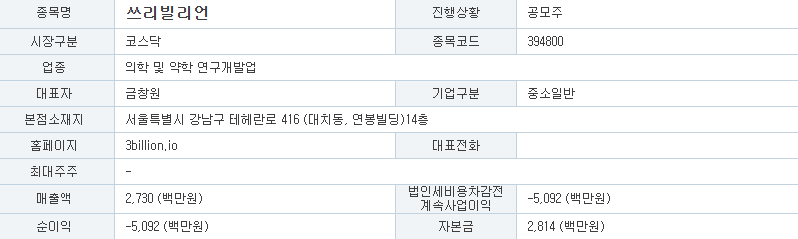 그럼 본격적으로 쓰리빌리언 공모주 수요예측 결과 확정 공모가 청약 상장일 투자 여부 정리를 살펴보도록 하겠습니다.