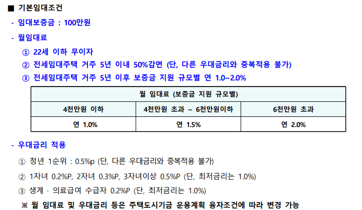 | 임대료 혜택 | 22세 이하 무이자, 5년 이내 50% 감면 |