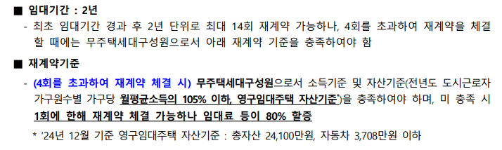4회 초과 재계약 시에는 전년도 도시근로자 월평균 소득의 105% 이하, 영구임대주택 자산기준을 충족해야 합니다.