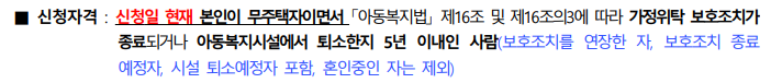 현재 보호조치 연장 중인 자, 보호조치 종료 예정자, 시설 퇴소예정자도 신청 가능하나 기혼자는 지원받을 수 없습니다.