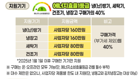 | 지원 품목 | 에너지효율 1등급 냉난방기, 냉장고, 세탁기, 건조기 | 냉동고, 김치냉장고 제외 |