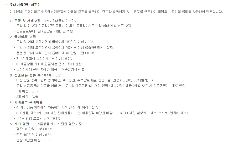 | 주요 우대조건 | - 첫 거래 고객 - 급여이체 실적 - 상품 보유 - 거래실적 - 예금잔액 |