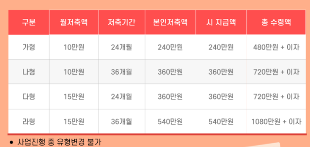 | 유형 | 월 저축액 | 저축기간 | 본인 적립액 | 시 지원금 | 총 수령액 |