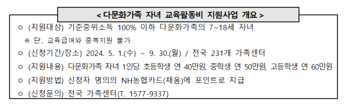 지원 대상은 기준중위소득 100% 이하 다문화가족의 7~18세 자녀이며, 교육급여와는 중복 지원이 불가합니다. 신청 관련 문의사항은 전국 가족센터(T. 1577-9337)에 연락하시면 자세한 안내를 받으실 수 있습니다.