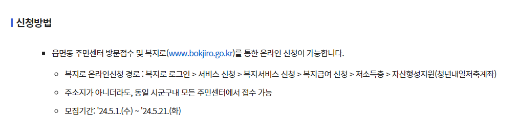 청년내일저축계좌 2024년도 모집기간은 5월 1일부터 5월 21일까지입니다.
