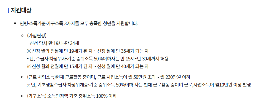 - 가입 대상은 연령, 근로·사업소득, 가구소득 기준을 모두 충족해야 함