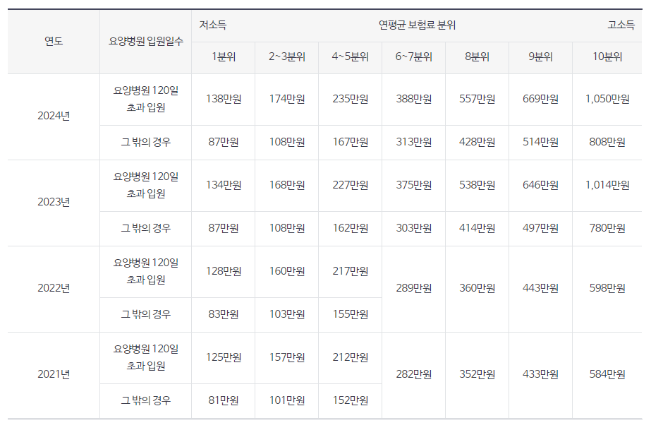 2024년 기준, 요양병원에 120일을 초과하여 입원할 경우 상한액은 1분위 138만원, 10분위 1,050만원으로 책정되었습니다. 그 외 경우에는 1분위 87만원, 10분위 808만원으로 결정되었습니다.
