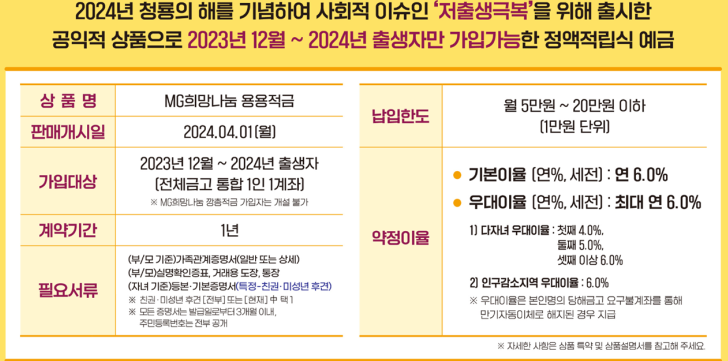 아기의 탄생을 진심으로 축하하는 마음을 담아 특별 기획한 만큼, 육아 부담을 덜고 차곡차곡 자산을 불릴 수 있는 기회가 될 것으로 기대됩니다. 저출산 시대에 맞서 육아 가정을 응원하는 MG새마을금고의 사회적 역할이 톡톡히 발휘되기를 바랍니다. 출산을 앞둔 예비 부모님들께 유익한 정보가 되셨기를 바라며, 긴 글 읽어주셔서 감사드립니다.