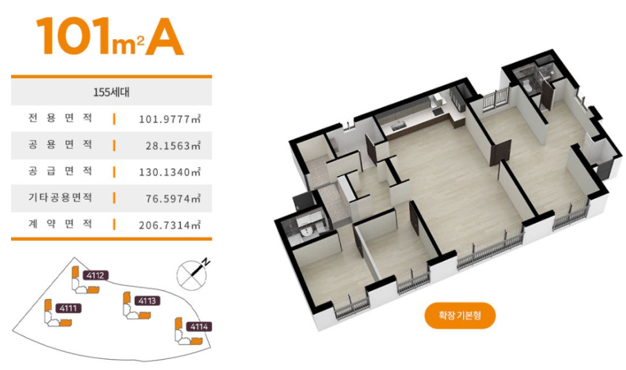 이번에 공급되는 2개 타입은 모두 101A 타입에 해당하는데요. 전용면적이 101㎡, 약 39평형대의 대형 평면입니다. 판상형 4베이 구조로 설계되어 개방감이 뛰어납니다.