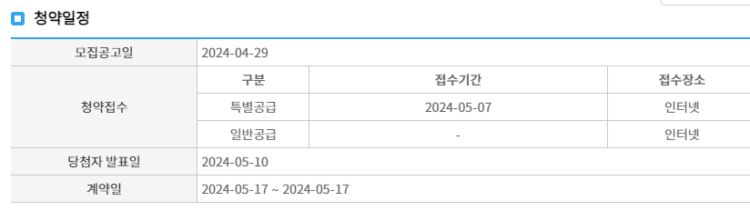 | 청약 일정 | 5/7 특별공급, 5/10 당첨자 발표, 5/14 서류 접수, 5/17 계약 |