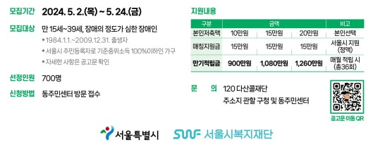 | 신청자격 | - 공고일 현재 서울시 거주 - 만 15세 ~ 만 39세 이하 (1984년 1월 1일 ~ 2009년 12월 31일 출생) - 장애의 정도가 심한 장애인 - 소득인정액 기준중위소득 100% 이하 가구 |