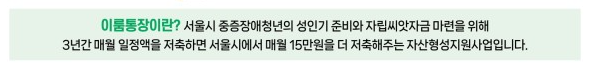 | 이룸통장 개요 | - 서울시 중증장애청년의 성인기 준비와 자립씨앗자금 마련 지원 사업 - 3년간 매월 일정액 저축 시 서울시가 매월 15만원 추가 적립 |
