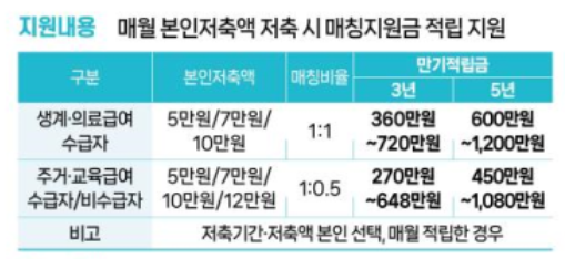 | 적립률 | 기초생활수급자 1:1, 비수급자 1:0.5 |