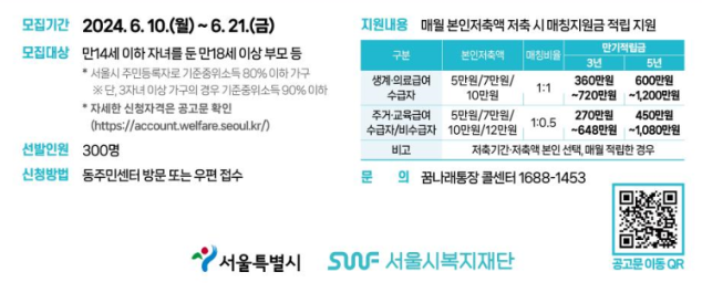 | 모집 대상 | 서울 거주, 만 14세 이하 자녀를 둔 만 18세 이상 부모 |