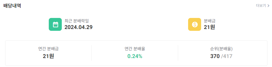 이 ETF는 월 단위로 분배금을 지급하고 있습니다. 가장 최근 분배락일인 2024년 4월 29일에는 주당 21원의 분배금이 결정되었습니다. 설정 후 1년이 경과되지 않아 아직 연간 분배금은 21원이며, 분배율(배당률)은 0.24%입니다.
