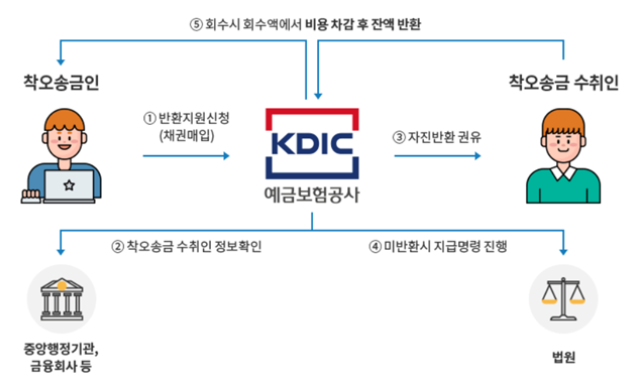 | 진행 절차 | 1. 예금보험공사에 신청 2. 착오송금 수취인의 연락처와 주소 확보 3. 자발적 반환 권유 4. 반환 거부 시 법원의 지급명령을 통해 강제 회수 5. 회수 비용 제외 후 착오송금인에게 입금 |
