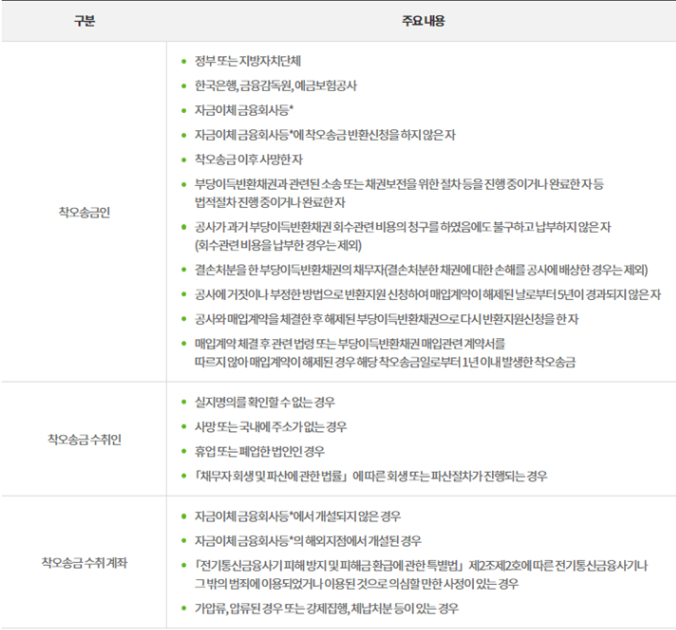 | 제외 대상 | - 고의성이 의심되는 경우 - 법적 절차가 진행 중인 경우 - 송금인과 수취인이 친족 관계인 경우 - 송금인과 수취인이 동일인인 경우 - 사기 등 범죄행위로 인한 송금인 경우 |