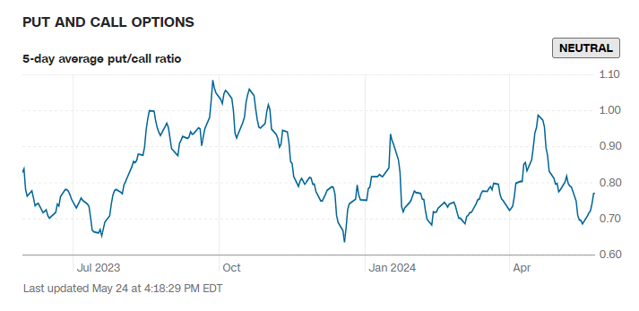 네 번째 지표는 풋옵션과 콜옵션 비율(Put and Call Options)입니다. 풋옵션은 매도권리, 콜옵션은 매수권리를 부여하는 파생상품인데요. 풋옵션 거래량이 콜옵션보다 많으면 공포, 그 반대면 탐욕으로 평가합니다.
