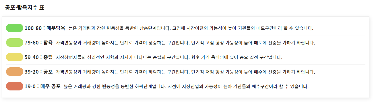 | 지수 범위와 구간 | 0-100 사이 값, 25 이하(극도의 공포), 25-50(공포), 50-60(중립), 60-75(탐욕), 75 이상(극도의 탐욕) |