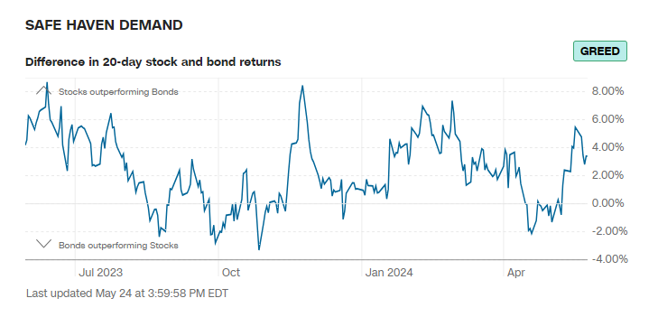 여섯 번째 지표는 안전자산 선호(Safe Haven Demand)입니다. 안전자산으로 꼽히는 채권 수익률과 주식 수익률 간 격차를 따집니다. 채권 수익률이 주식을 앞선다면 공포, 반대라면 탐욕으로 봅니다.