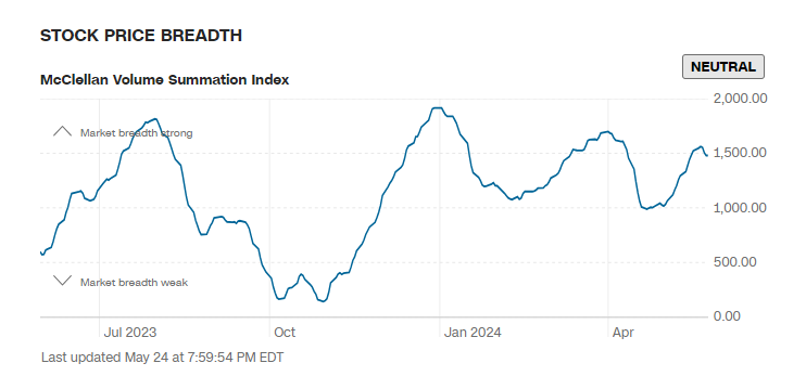세 번째 지표는 주식 거래량(Stock Price Breadth)입니다. NYSE 시장에서 상승 종목과 하락 종목의 거래량을 대조합니다. 하락 종목 거래량이 많으면 공포, 상승 종목 거래량이 많으면 탐욕으로 해석합니다.