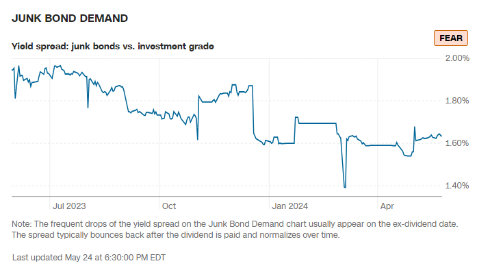일곱 번째 지표는 위험채권 수요(Junk Bond Demand)입니다. 투자부적격 등급의 고위험 회사채에 대한 수요를 가늠합니다. 위험채권 수요가 늘면 탐욕, 줄면 공포로 평가합니다.