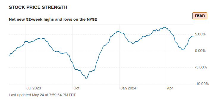 두 번째 지표는 주가 강도(Stock Price Strength)입니다. 뉴욕증권거래소 상장 종목 중 52주 신고가와 신저가에 도달한 종목 수를 집계하는데요. 신고가 종목이 우세하면 탐욕, 신저가 종목이 우세하면 공포로 판단합니다.