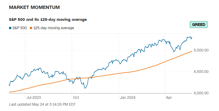첫 번째 지표는 주가 모멘텀(Stock Price Momentum)입니다. S&P500 지수가 125일 이동평균 대비 어느 정도의 강세를 보이는지 측정합니다. 주가가 이동평균선을 상회하면 탐욕, 하회하면 공포로 분류합니다.