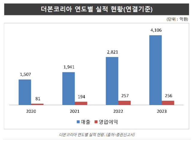 더본코리아의 실적은 가파른 성장세를 그리고 있습니다. 2022년 매출액은 2,822억 원이었으나 2023년에는 무려 4,107억 원까지 뛰어올랐습니다.