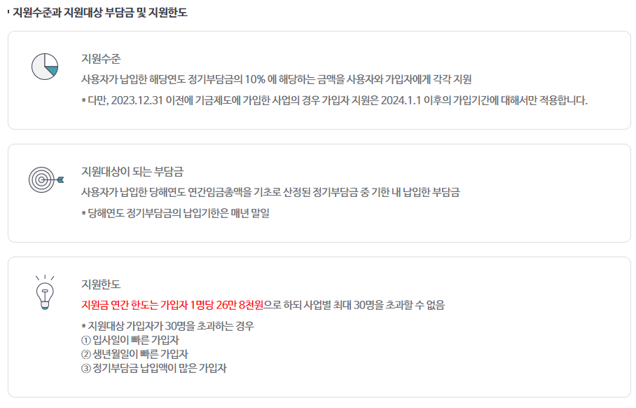사용자의 부담금 수준은 확정기여형퇴직연금(DC)과 마찬가지로 임금총액의 1/12 이상으로 사전에 정해져 있으며, 근로자 역시 원할 경우 추가 부담금 납입이 가능합니다.