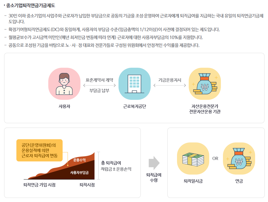 | 혜택 및 장점 | - 월평균보수 일정 금액 미만 근로자에 대한 정부 지원금 - 공동기금 형태로 운영되어 안정적 수익 기대 - 퇴직연금사업자 선정 및 관리 부담 없음 |