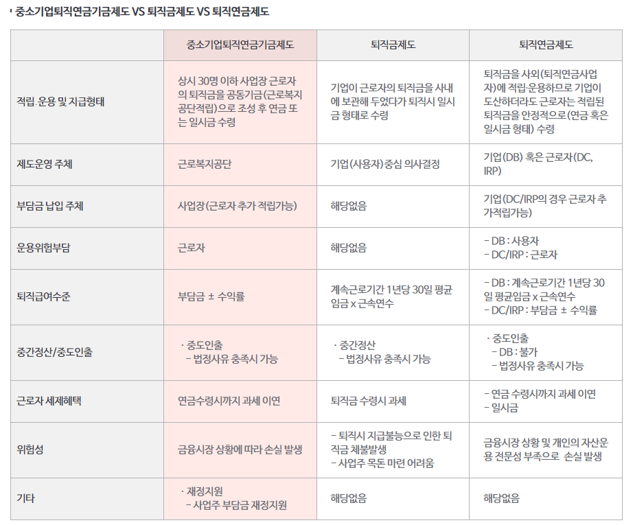 | 적립운용 및 지급형태 | 공동기금으로 조성 후 연금 또는 일시금 수령 | 사내 적립, 퇴직 시 일시금으로 수령 | 사외 적립, 연금 또는 일시금으로 수령 |