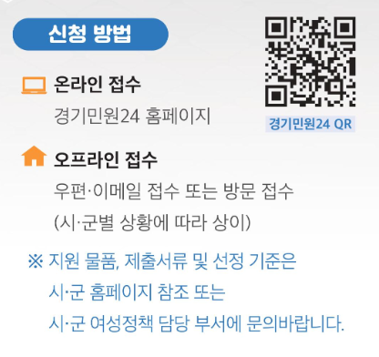 경기도 여성 1인가구 여성안심 패키지 지원사업 신청은 경기민원24 홈페이지(https://gg24.gg.go.kr)에서 온라인으로 접수합니다.