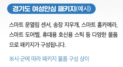 | 지원 내용 | 창문잠금장치, 스마트 문열림센서 등 안전용품을 담은 여성 1인가구 안심패키지 지원 ※ 품목은 지역상황에 따라 시군별 선택 가능 |
