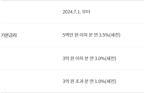 | 기본금리 | 5백만원 이하 분: 연 3.5%(세전) 3억원 이하 분: 연 3.0%(세전) 3억원 초과 분: 연 1.0%(세전) |