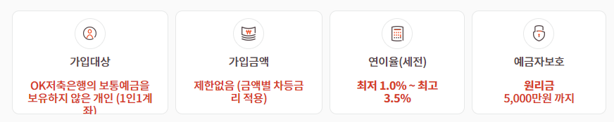 | 가입대상 | OK저축은행 보통예금 미보유 개인 (1인 1계좌) |