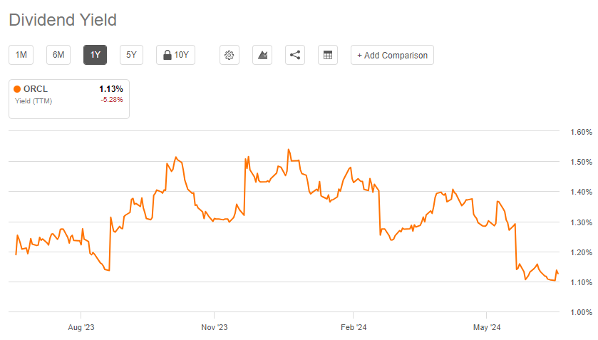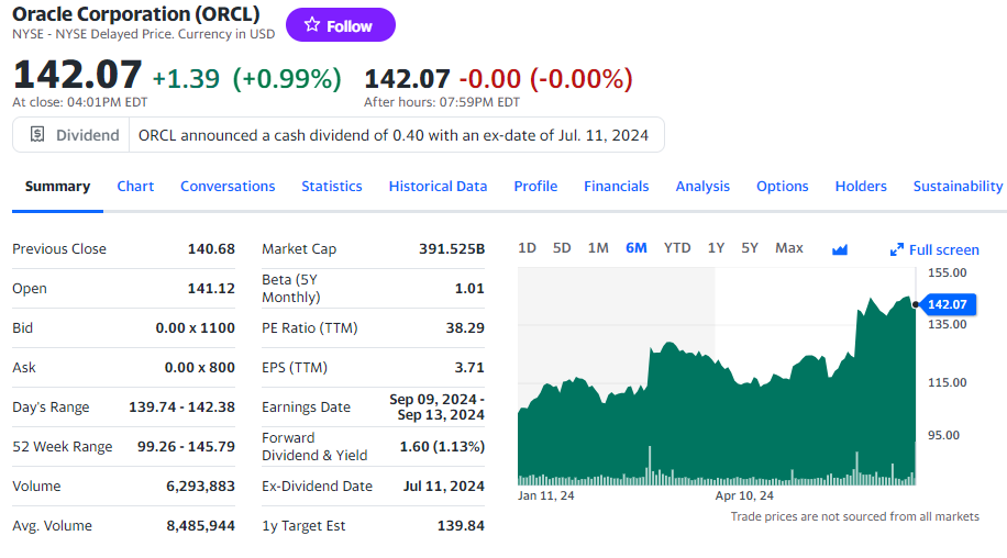 오라클은 3개월마다 배당금을 지급하고 있습니다. 현재 연간 배당금은 주당 1.60달러이며, 배당 수익률은 1.14% 수준입니다.