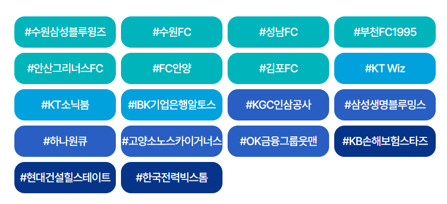 - 축구(7개 팀): 수원FC(K1리그), 수원삼성블루윙즈, 성남FC, 부천FC1995, 안산그리너스FC, FC안양, 김포FC(이상 K2리그)