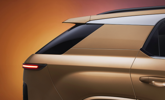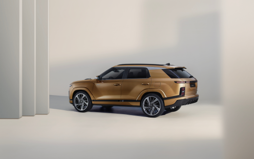 측면부와 후면부는 직선형 캐릭터 라인과 바디 컬러 가니시의 조화를 통해 와이드한 볼륨감을 강조하고 있습니다. 특히 쿠페 스타일의 슬로핑 루프라인이 돋보이며, 이는 차량에 역동적이고 스포티한 이미지를 부여합니다.