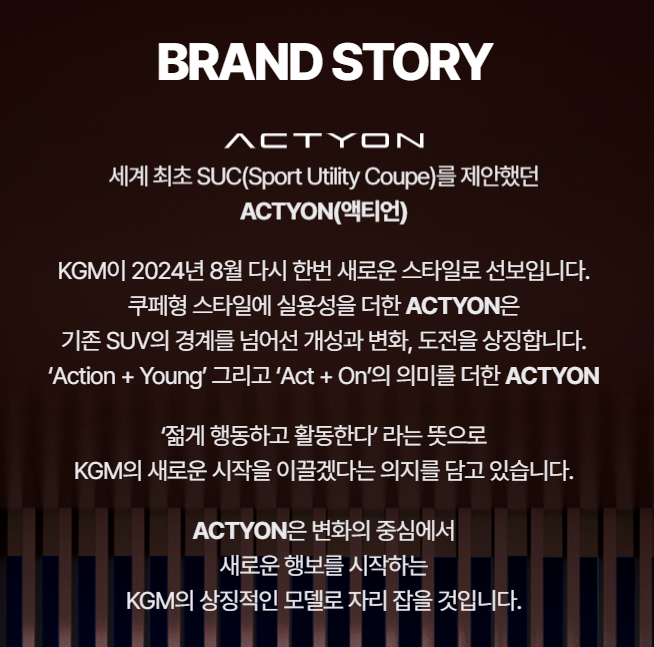 KGM은 이러한 조합을 통해 '젊게 행동하고 활동한다'는 컨셉을 표현하고자 했습니다. 이는 액티언이 단순한 이동 수단을 넘어서 활동적이고 젊은 감성을 지닌 소비자들의 라이프스타일을 반영하고자 하는 의도를 담고 있음을 의미합니다.