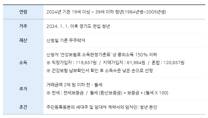 | 신청 대상 | 만 19-39세 경기도 거주 무주택 청년 |