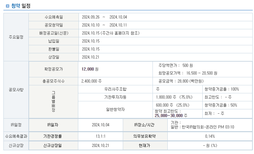확정 공모가 역시 희망공모가 밴드인 16,500원 ~ 20,500원을 크게 하회하는 12,000원으로 결정되었습니다. 이는 기관들의 저조한 관심도를 반영한 결과로 해석됩니다.