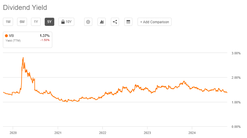 VB ETF는 3개월마다 배당금을 지급하며, 현재 기준 연간 배당률은 1.38%입니다.